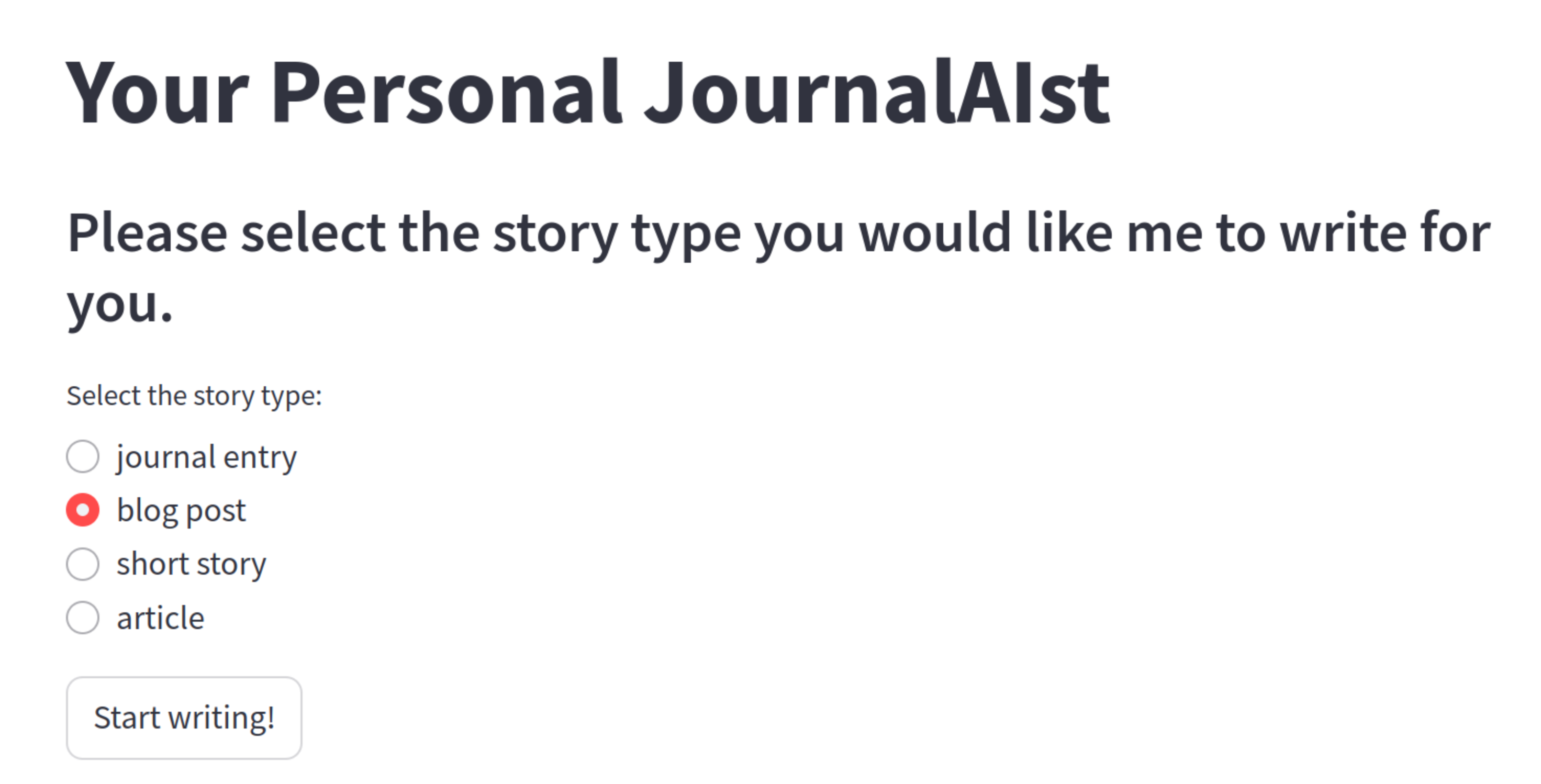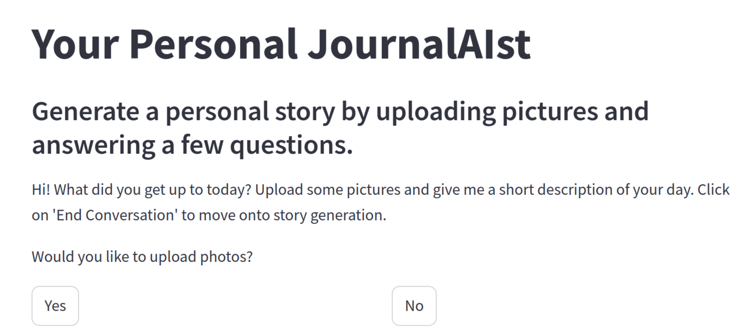 So we basically built the app using Streamlit (called JournalAIst) as two parts: an interviewer and a writer. Basically we had a chat loop in which you could upload images (interpreted by Pixtral) and during which the interviewer model (mistral-large-2407) would ask you questions about your experience and the images that you added. After answering the interviewers questions for a while, you can choose to end the conversation, after which you are sent to the writer.