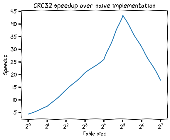 As you can see from the above, with a 32-byte table we hit our maximum speedup of around 40 times as fast as the naive implementation. After that, the performance falls off a cliff.